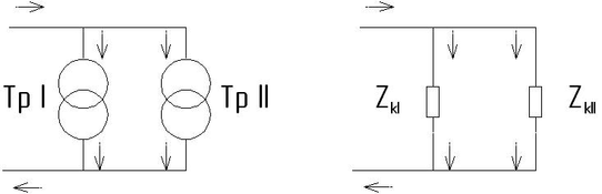 С некоторым приближением, пренебрегая токами холостого хода, можно параллельно включенные трансформаторы заменить их сопротивлениями короткого замыкания ZkI и Zkii [2].