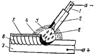 Дуга горит между стержнем электрода 1 и основным металлом 7. Под действием теплоты дуги электрод и основной металл плавятся, образуя металлическую сварочную ванну 4. Капли жидкого металла 8 с расплавляемого электродного стержня переносятся в ванну через дуговой промежуток. Вместе со стержнем плавится покрытие электрода 2, образуя газовую защиту 3 вокруг дуги и жидкую шлаковую ванну на поверхности расплавленного металла.