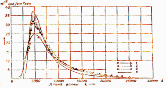Рис.1. Распределение энергии в спектре солнечной радиации на границе атмосферы: 1- по данным 1903-1910 гг., 2 - 1920-1922 гг., 3 - 1917 г., 4 - абсолютно черное тело при температуре 57130К.
