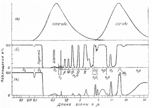Рассмотрим избирательное поглощение лучистой энергии в атмосфере. Любое вещество имеет свои полосы поглощения (рис.3.[1]). Из газов, входящих всегда в состав атмосферы, существенным для нас селективным поглощением обладают лишь O2, O3, CO2 и водяной пар H2O. Кислород вызывает интенсивное поглощение света