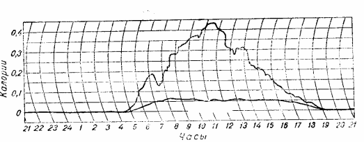 Рис.5. Рассеянная радиация атмосферы при безоблачном небе и при сплошной облачности (10 баллов).