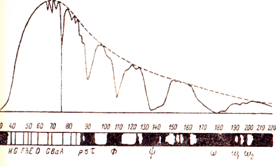 Как видно из рис.1., энергетический спектр излучения близок к спектру абсолютно черного тела при температуре T60000К, но не совпадает с ним, т.к. яркость солнечного диска планомерно уменьшается от его центра к краям. Наилучшей формой представления распределения энергии в солнечном спектре является формула В.Г. Кастрова:
