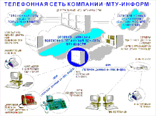 Телефонная сеть компании "МТУ-Информ" предназначена для оказания разнообразных телефонных услуг индивидуальным и корпоративным клиентам г. Москвы. Сеть базируется на принадлежащих компании электронных цифровых АТС, а в качестве транспортной среды используется . Номерная емкость составляет в настоящее время примерно 100000 номеров, входящих в нумерацию Московской городской телефонной сети. Таким образом, по числу обслуживаемых абонентов компания "МТУ-Информ" является вторым после АО "МГТС" оператором телефонной связи в Москве. Телефонные услуги, предоставляемые "МТУ-Информ", отличает высокое качество. Его составляющие — хорошая слышимость, надежность установления соединения, стабильность параметров сигнала и т. д. Располагая собственной транспортной сетью, равномерно покрывающей практически весь город, "МТУ-Информ" имеет возможность обеспечивать связь с абонентами МГТС, доставляя сигнал к центральной АТС компании по своей цифровой сети. Устаревшие аналоговые АТС, на которых в значительной степени происходит потеря качества сигнала, при этом не используются. Центральный узел сети "МТУ-Информ" имеет выходы на другие города и за пределы России через СП "СЦС Совинтел" и АО "Ростелеком". Благодаря высоким характеристикам телефонной сети "МТУ-Информ" ее услугами пользуются: