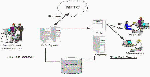 Структуру Центра можно представить в виде блоков IVR (Interactive Voice Response) и Call Center. В IVR разрабатывается и запускается сценарий обработки вызова абонента, определяются набираемые цифры в процессе диалога с системой, определяется номер абонента, выдаются речевые сообщения и подсказки, генерируются переменные данные сообщения (числа, даты и др.), осуществляется авторизация, биллинг и доступ к базам. Основой Call Center является T-Server, который поддерживает агентские приложения (agent applications), управляет телефонной станцией, распределяет подключение агентов (Intelligent Call Delivery), отслеживает их работу и поток вызовов (Monitoring). Данные накапливаются и обрабатываются в сервере статистики (Stat Server). В сервере баз данных (DB Server) хранятся базы, необходимые для работы агентов. Также агенты могут использовать данные из глобальной сети и локальных баз арендаторов ресурсов Узла.