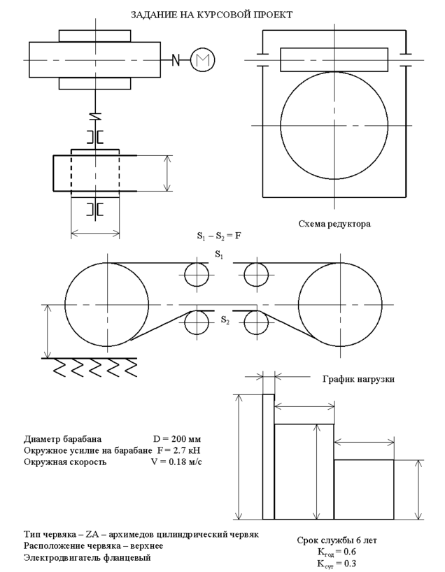 Нам в нашей работе необходимо спроектировать редуктор для ленточного конвейера, а также подобрать муфты, двигатель, спроектировать раму. Редуктор состоит из литого чугунного корпуса, в котором помещены элементы передачи – червяк, червячное колесо, подшипники, вал и пр. Входной вал посредством муфты соединяется с двигателем, выходной – с конвейером.