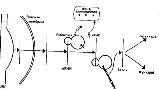 Рис. 2.7. Транскрибирование ДНК в мРНК и трансляция в белки. Трансляция происходит на субклеточных органеллах — рибосомах; молекулы транспортной РНК (тРНК) выбирают из клеточного фонда аминокислот нужную аминокислоту и переносят ее на соответствующее место на матрице. Образующийся таким образом белок может затем выполнять в клетке структурные или ферментативные функции. (Calow P., Biological Machines, Edward Arnold Publ., London, 1976.)