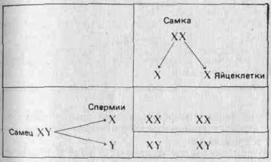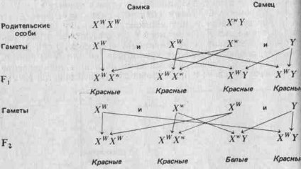 (Отметим, что у птиц и у некоторых насекомых наблюдается обратная картина: гетерогаметны самки, а самцы гомогаметны.) Соотношение полов рассматривается более подробно в разд. 3.7. Половые хромосомы X и Y морфологически отличаются от остальных хромосом (аутосом) и друг от друга. Поэтому можно ожидать, что они содержат уникальные аллели, которые не могут переходить из одной хромосомы в другую в результате кроссинговера. Это может привести к отклонениям от предсказаний Менделя; явление это известно под названием сцепления с полом. Например, аллель, определяющий красный цвет глаз У Дрозофилы, о котором говорилось выше, как и аллель белого Цвета глаз, локализован в Х-хромосомах. В Y-хромосомах этих аллелей нет. Красный цвет глаз доминирует над белым. Когда Морган скрещивал красноглазых самок с белоглазыми самцами, все потомство fj оказалось красноглазым. При скрещивании красноглазых самцов и самок из fi он получил красноглазых и белоглазых мух в соотношении 3:1, но все белоглазые мухи были мужского пола. Отношение красноглазых самок к красноглазым самцам составляло 2:1. Если, заменив обозначения, принятые на стр. 27, обозначить аллель красных глаз через Xw, а аллель белых глаз — через Xw, то нетрудно дать объяснение! наблюдаемым результатам: