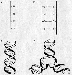 Рис. 2.6. Строение ДНК. А. Нуклеотиды (В), соединенные в цепь. Б. Комплементарные цепи, образующие «веревочную лестницу» при помощи водородных связей (прерывистые линии). В, «Веревочная лестница», свернутая в двойную спираль. Г. Репликация: цепи раскручиваются, и каждая из них служит матрицей для образования комплементарной цепи.