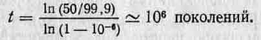 Теперь мы можем использовать это уравнение для выяснения того, сколько потребуется поколений при частоте мутаций 1:106, чтобы сдвинуть частоту аллеля а (то есть д) с 0,1 до 50%. Если р=\—д, то, следовательно, частота аллеля А должна при этом измениться от 99,9 до 50%; поэтому