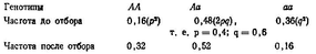 Простейший возможный случай относится к одному локусу с двумя аллелями, например Л и а, с частотами соответственно р и q. Большая часть рассуждений в популяционной генетике основана на системе именно такого типа. Допустим, что в результате отбора равновесие Харди—Вайнберга в некоей воображаемой популяции сдвигается следующим образом: