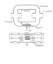 В отличие от резонансного вентиля, напряженность постоянного магнитного поля выбирается значительно ниже величины Hорез, соответствующей условию ферромагнитного резонанса. При этом потери в феррите для обоих направлений вращения высокочастотного магнитного поля могут быть сделаны достаточно малыми. Однако ввиду различия величин активной и пассивной магнитных проницаемостей фазовые скорости волн, распространяющихся по волноводу в противоположных направлениях, также оказываются различными.Выберем такую длину ферритовой пластины, при которой разность фазовых сдвигов в “прямом” и “обратном” направлениях составляет ровно π. Такой четырёхполюсник иногда называют гиратором. Тогда при подаче сигнала на вход 1 схемы, изображённой на рис. 2,а (т. е. в Н- плечо двойного тройника), две волны, приходящие во второй тройник и являющиеся первоначально синфазными, оказываются в противофазе ввиду сдвига на π в гираторе. С учётом свойств тройниковых разветвлений передача энергии в этом случае возможна только в Е- плечо, обозначенное цифрой 2. Таким образом, вся мощность, поданная на вход 1, поступает без потерь и отражения в плечо 2.