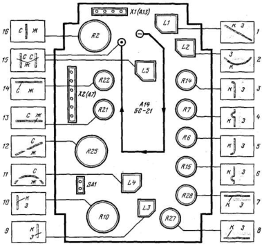 Рис.5. Расположение органов регулировки на плате блока сведения БС-21.