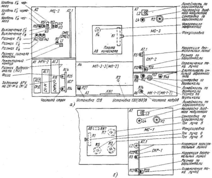Рис.6. Расположение органов регулировки на модулях телевизоров 3УСЦТ при использовании кинескопов с самосведением 51ЛК2Ц, 61ЛК5Ц, 67QQ22 (а) и с дельтаобразным расположением ЭОП - 61ЛК4Ц (б).