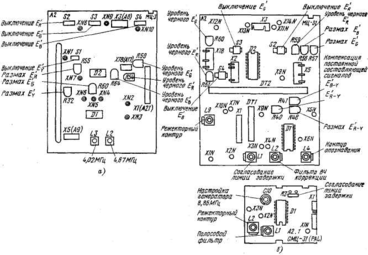 Рис.7. Расположение органов регулировки в модулях цветности МЦ-3 (а) и МЦ-31-1 с субмодулем (б).