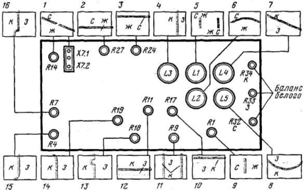 Для регулировки баланса белого в домашних условиях может быть использована градационная шкала, которая создаётся в нижней части УЭИТ (горизонтальные полосы 14 и 15) при выключенном канале цветности. Перед началом регулировки необходимо установить регуляторы цветового тона в среднее положение и убедиться в отсутствии цветных пятен на растре, обусловленных нарушением чистоты цвета. Расположение регулировок на кроссплате БОС телевизора УПИМЦТ-61 показано на рис.2.