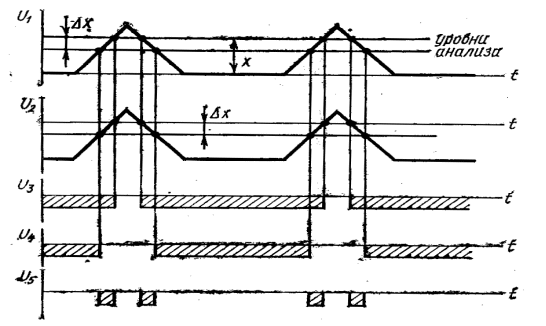 С помощью амплитудных селекторов и формирователей вырабатываются прямоугольные импульсы длительность которых равна времени пребывания входного сигнала ниже порогов селекции. Величина постоянной составляющей на выходе ВС пропорциональна P{X(t)<=x} на выходе НС - P{X(t)<=x-x}, на выходе ВУ: