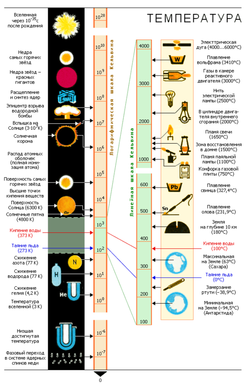 На шкале вы найдете температуры внутренних зон самых горячих звезд, Вселенной вскоре после ее рождения, газов, вытекающих из сопла ракеты, и многих других объектов и процессов. Но, конечно, один рисунок не может вместить все обилие значений температур, встречающихся в природе и технике. Он только информация к размышлению.