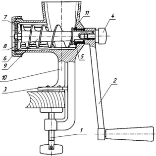 Винт 1, который с помощью опоры 3 крепится к столу; рукоятки 2, закрепленной с помощью винта 4 со шнеком 9; последний вращается в тулке 5 и втулке шнека 11; на конце шнека 9 закреплены нож 7 и решетка 8, которые в свою очередь в месте со шнеком 9 фиксируются нажимной гайкой 6.