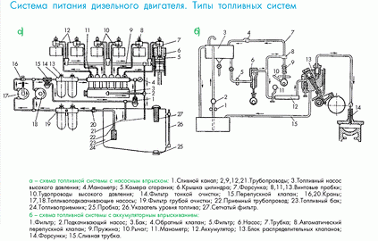 Из топливного бака дизельное топливо засасывается насосом высокого давления через топливный фильтр, который задерживает воду и грязь.- Топливо подается только в том случае, если в системе нет воздуха. В насосе создается необходимое для впрыска давление, и топливо распределяется по цилиндрам. Количество впрыскиваемого топлива регулируется нажатием педали акселератора. Через форсунки топливо подается в предкамеру соответствующего цилиндра. Так как дизельный двигатель не нуждается в зажигании И его цикл не прекращается при отключении напряжения в системе нахального зажигания, в конструкции дизельного двигателя предусмотрен магнитный клапан. При выключении зажигания напряжение на нем исчезает, и канал поступления топлива закрывается. В систему питания дизельного двигателя грузового автомобиля (КамАЗ-740) входят топливный бак, фильтр грубой очистки воздуха, фильтр тонкой очистки воздуха, топливоподкачивающий насос, топливный насос высокого давления с регулятором частоты вращения и автоматической муфтой опережения впрыска топлива, форсунки, трубопроводы высокого давления, трубопроводы низкого давления, воздушный фильтр, выпускной газопровод, глушители шума отработавших газов. Подача топлива осуществляется по двум магистралям: высокого и низкого давления. В магистрали низкого давления хранится топливо, происходят его фильтрация и подача под малым давлением к топливному насосу высокого давления. В магистрали высокого давления обеспечиваются подача и впрыскивание необходимого количества топлива в цилиндры двигателя в определенный момент. Топливоподкачиваюший насос подает топливо из бака через фильтры грубой и тонкой очистки по топливопроводам низкого давления к топливному насосу высокого давления (ТНВД), который в соответствии с порядком работы цилиндров по топливопроводам высокого давления подает топливо к форсункам. Форсунки, расположенные в головках цилиндров, впрыскивают и распыляют топливо в камеры сгорания двигателя. Так как топливоподкачиваюший насос подает топливному насосу высокого давления топлива больше, чем нужно, то его избыток, а с ним и попавший в систему воздух по дренажным трубопроводам отводится обратно в бак.