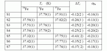 Таблица 2. Критическая температура, сдвиг критической температуры и показатель степени в изотопическом эффекте по железу в зависимости от изотопа Fe, входящего в состав сверхпроводящих поликристаллов Ba1–xKxFe2As2