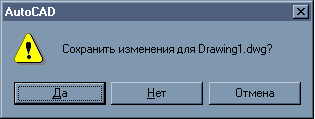 | Закрыть (Close) | Любой из открытых рисунков может быть закрыт с помощью пункта Закрыть. AutoCAD анализирует, сохранены ли изменения рисунке, и если нет, то задает вопрос Сохранить изменения в _имя файла_(Save changes to …). Рисунок 7. Окно сохранения изменений Необходимо с помощью мыши щелкнуть по кнопке Да, если изменение нужно сохранить, или Нет, если изменения не нужны. |