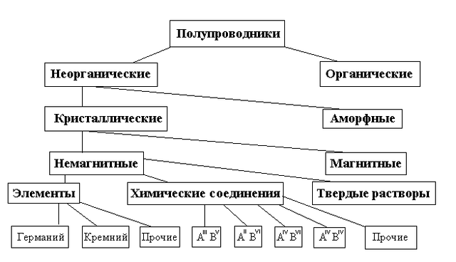 Полупроводники представляют собой весьма многочисленный класс материалов. В него входят сотни самых разнообразных веществ – как элементов, так и химических соединений. Полупроводниковыми свойствами могут обладать как неорганические, так и органические вещества, кристаллические и аморфные, твердые и жидкие, немагнитные и магнитные. Несмотря на существенные различия в строении и химическом составе, материалы этого класса роднит одно замечательное качество- способность сильно изменять свои электрические свойства под влиянием небольших внешних энергетических воздействий. Одна из возможных схем классификации полупроводниковых материалов приведена на рис.1