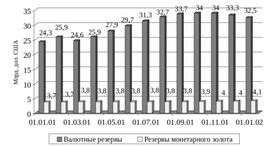 Официальные валютные резервы выросли на 8,2 млрд. дол. (в 2000г. – 16,0 млрд. дол) и на первое января 20002 г. составили 32,5 млрд. дол., что с учетом запасов монетарного золота (4,1 млрд. дол.), по методологии Банка России является близким к величине, рассматриваемой как достаточной для плавного перевода платежного баланса страны к новому равновесному состоянию в случае возникновения форс-мажорных обстоятельств во внешней сфере.