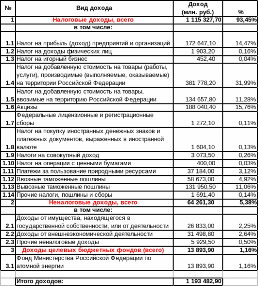 Налоговые доходы составляют 1115,32 млрд. руб. или 93,45% от всех доходов (1193,48 млрд. руб.).