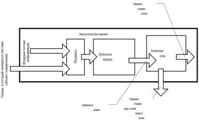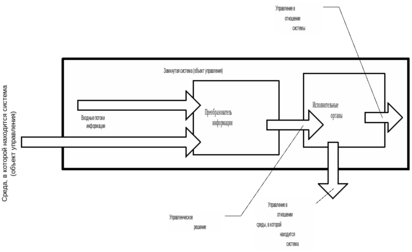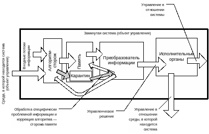 Входной поток информации (внешние и внутренние обратные связи) поступает в преобразователь, где на основе сиюминутно текущей информации вырабатывается текущее управленческое решение, которое передаётся к исполнительным органам.Возможны такие варианты сочетания входного потока информации и характеристик преобразователя информации, вырабатывающего управленческое решение, в результате которых «самоуправляющаяся» таким образом система в действительности оказывается управляемой извне, если кто-то подает на её вход соответствующий поток информации, предвидя реакцию преобразователя на каждый из её вариантов.