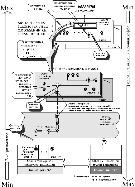 Мы рассматривали эту систему, начиная от лидера структуры. Но исторически реально системы такого рода дистанционного управления лидером целенаправленно выстраиваются в течение годов и десятилетий в обратной направленности: от знахарей концепций к публичным лидерам отраслей общественной деятельности; а также и сами лидеры в ряде случаев создаются при развертывании такой системы и продвигаются на тот или иной пост аналогично тому, как по шахматной доске передвигаются фигуры при развертывании той или иной стратегии шахматной игры.