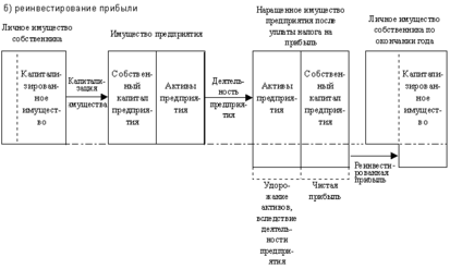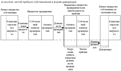 Как видно из схемы, богатство собственника увеличивается в любом случае. Однако при получении дивидендов увеличивается та часть имущества собственника, которая находится в его непосредственном распоряжении и может быть использована для личного потребления. В другом случае увеличивается отчужденная часть его имущества, вложенная в собственный капитал предприятия. Однако подобное отчуждение не означает полной утраты собственности на это имущество. При необходимости владелец может продать свою долю в собственном капитале предприятия и получить взамен деньги, которые может использовать по своему усмотрению.