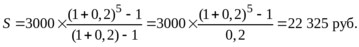 В нашем примере член ренты R неизменен в течение всего срока, процентная ставка i также постоянна. Поэтому наращенную величину ренты можно найти как сумму геометрической прогрессии с первым членом 3000 и знаменателем (1 + 0,2)