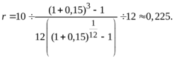 Размер долга по займу (10 млн. руб.) был задан как условие предыдущего примера. На самом деле, часто данный параметр также является вычисляемой величиной, так как наряду с основной суммой займа должник обязан выплачивать проценты по нему. Предположим, что 10 млн. руб. – это основная задолженность по облигационному займу, кроме этого необходимо ежегодно выплачивать кредиторам 10 % основной суммы в виде процентов. Чему будет равна сумма ежемесячного взноса в погасительный фонд с учетом процентных выплат по займу? Так как проценты должны выплачиваться ежегодно и их годовая сумма составит 1 млн. руб. (10 млн. руб. 10 %), нам опять следует рассчитать член ренты r (R/12) по ренте сроком n = 1 год, p = 12, m =1, i = 15 %. По базовой формуле (2.3.6) его величина составит