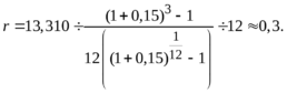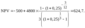 Если денежный поток состоит из одинаковых и равномерно рапределенных выплат (т. е. представляет собой аннуитет), можно упростить расчет NPV, воспользовавшись формулами дисконтирования аннуитетов из табл. 2.3.3 предыдущего параграфа. Например, если бы в рассматриваемом проекте было предусмотрено получение в течение трех месяцев по 400 тыс. руб. дохода ежемесячно (т. е. R = 4800), то следовало рассчитать приведенную стоимость аннуитета сроком 3/12 года и числом выплат p = 3. Применив формулу (2.3.12) из предыдущего параграфа, получим