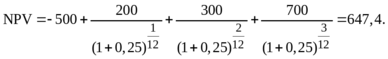 Под процентной ставкой i (в данном случае ее называют ставкой сравнения) понимается годовая сложная эффективная ставка декурсивных процентов. Срок операции n в общем случае измеряется в годах. Если же реальная операция не отвечает этим условиям, т. е. интервалы между платежами не равны году, то в качестве единицы измерения срока принимаются доли года, измеренные, как правило, в месяцах, деленных на 12. Например, инвестиции в сумме 500 тыс. руб. принесут в первый месяц 200 тыс. руб. дополнительного дохода, во второй – 300 тыс. руб. и в третий – 700 тыс. руб. Ставка сравнения равна 25 %.