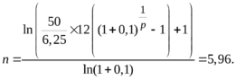 520,8 тыс. руб. (6,25/12). Задачу можно сформулировать иначе: за сколько лет предприятие возместит первоначальную стоимость основных средств, размещая на депозите сумму амортизационных отчислений по линейному методу (520,8 тыс. руб. в месяц или 6,25 млн. руб. в год)? Для решения этой задачи (нахождение срока ренты n) снова понадобится формула (2.3.6), но теперь она будет преобразована следующим образом: