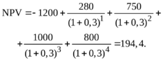 О достоинствах и особенностях чистой приведенной стоимости будет очень подробно говориться в последующих главах. Остается только заметить: ее значение для финансового менеджмента настолько высоко, что многократно окупает затраты труда по изучению и осмыслению всех вышеприведенных формул финансовых вычислений. Вторым столь же важным финансовым показателем является внутренняя норма доходности (IRR – от английского internal rate of return). Рассмотрим еще один инвестиционный проект. Внедрение новой технологии требует единовременных затрат в сумме 1,2 млн. руб. Затем в течение четырех лет предприятие планирует получать дополнительный денежный поток от этих инвестиций в размере: первый год – 280 тыс. руб., второй год – 750 тыс. руб., третий год – 1 млн. руб. и четвертый год – 800 тыс. руб. Рассчитаем NPV этого проекта при ставке сравнения 30 % годовых