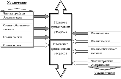 Если рассматривать все эти изменения с точки зрения влияния, оказываемого ими на чистый денежный поток предприятия, то их можно охарактеризовать как движение финансовых ресурсов (фондов). Под приростом финансовых ресурсов при этом понимается возникновение любого потенциального источника увеличения чистого денежного потока. Сокращение такого источника называется вложением финансовых ресурсов. Например, продавая свои запасы, предприятие получает от покупателя деньги, увеличивая тем самым чистый денежный поток. Следовательно, уменьшение запасов означает прирост финансовых ресурсов. Но точно к такому же результату приводит возникновение или увеличение кредиторской задолженности перед поставщиком – предприятие получает возможность не расходовать свои деньги в течение определенного времени, т. е. сокращает денежный отток, что равносильно увеличению притока. «Сэкономил – это все равно, что заработал». Значит, увеличение кредиторской задолженности также равносильно приросту финансовых ресурсов. Когда придет время погашать задолженность, предприятию придется раскошелиться, следовательно, снижение кредиторской задолженности уменьшает чистый денежный поток. Поэтому снижение кредиторской задолженности отражает вложение финансовых ресурсов. С дебиторской задолженностью обратная ситуация: ее увеличение равнозначно сокращению чистого денежного потока (вложению финансовых ресурсов), а снижение долга дебиторов означает дополнительный приток денег (прирост финансовых ресурсов).