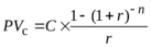 Равномерные выплаты купонного дохода представляют собой аннуитет, приведенная стоимость которого суммируется с приведенной стоимостью разовой выплаты нарицательной стоимости облигации в конце срока. Принципиально важную роль в этом расчете имеет ставка сравнения r, которая представляет собой альтернативную стоимость денежных средств для инвестора (см. § 3.3). В случае неизменной величины купонного дохода и процентной ставки r первое слагаемое формулы (3.4.2) может быть представлено в более удобном для использования виде (формула 2.3.4 из § 2.3)