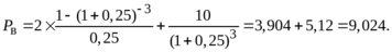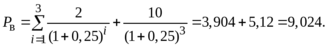Рассмотрим пример: номинал облигации – 10 тыс. руб., срок – 3 года, купонная ставка – 20 %, выплата купона – один раз в год (в конце года). Найти ее внутреннюю стоимость, если приемлемая для инвестора ставка сравнения составляет 25 % годовых. Ожидаемый денежный поток от владения облигацией можно представить следующим образом: