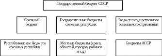 Государственный бюджет СССР объединял союзный бюджет, государственные бюджеты 15 союзных республик и бюджет государственного социального страхования. В свою очередь государственный бюджет союзной республики включал республиканский бюджет союзной республики, государственные бюджеты АССР и местные бюджеты — областей, краев, округов, районов, городов, поселковые и сельские бюджеты.