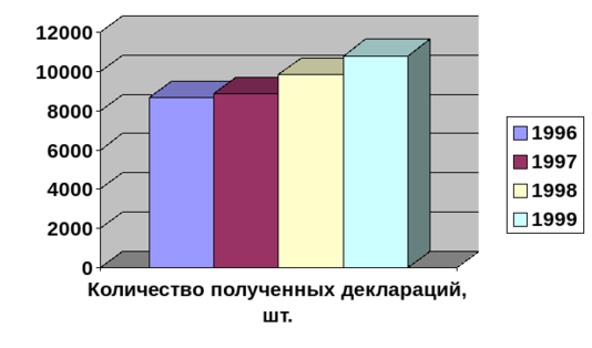 Так, к 1 апреля 1998 года декларации добровольно представили 8420 человек, а в период с 1 апреля 1998 года до 1 января 1999 года налоговые органы принудили представить декларации еще более 1400 человек, что составляет 14,6% от числа граждан, подавших декларации.