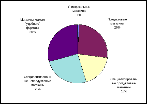 По данным исследований, проведенным в 12 крупнейших городов России, на долю универсальных магазинов приходится не более 1% от числа всех торговых точек, наибольшее распространение получили малые “удобные” магазины [30] (рис.9):