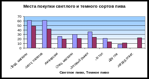 Самыми популярными местами покупки светлого пива являются продовольственные магазины и торговые павильоны. В таких точках приобретают пиво более 00% респондентов (см. Таблицу 0.0).