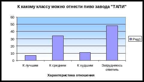 Около половины опрошенных (00%) не смогли определить, к какому классу следует отнести пиво Завода «ТАПИ». Наибольшие трудности этот вопрос вызвал у женщин, молодых людей в возрасте до 00 лет, лиц с доходом от 0000 до 0000 рублей (см. Рис. 0.0, Таблицу 0.0).