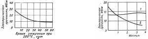 Однако снижение такого показателя электрических свойств как электрическая прочность, происходит и после теплового старения слоистых пластиков. Из приведённых ниже графиков следует, что если даже кратковременный нагрев до соответствующей температуры может не влиять на электрическую прочность слоистого пластика, то тепловое старение при такой же температуре приводит к снижению его электрической прочности.