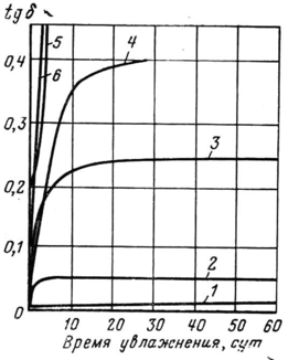 Также увлажнение в заметной степени ухудшает электрические характеристики слоистых пластиков. При этом очень чувствительными показателями оказываются tg и сопротивление изоляции, что видно из графиков.