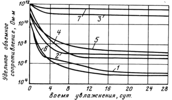 Зависимость удельного объёмного сопротивления слоистых пластиков от времени увлажнения при относительной влажности воздуха 95-98% и температуре 35С