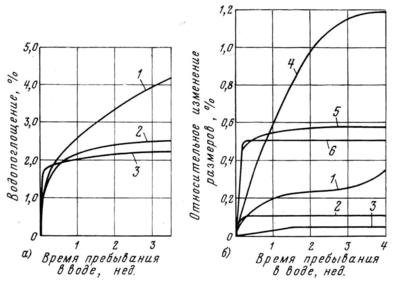 Влияние увлажнения. Большинство слоистых пластиков обладает сравнительно высоко влагопоглощаемостью. Исключение составляют такие пластики как текстолит ЛТ и стеклотекстолит СТВЭ, изготовленные с применением негидрофильных наполнителей, у которых водопоглощаемость оказывается и существенно не увеличивается при продолжительном увлажнении. У всех других видов слоистых пластиков с течением времени водопоголощение увеличивается до насыщения. Одновременно с увеличением водопоглощения изменяются и размеры самого пластика.