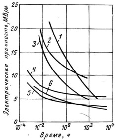 Зависимость электрической прочности слоистых пластиков перпендикулярно слоям от времени приложения электрического напряжения (частотой 50 Гц)